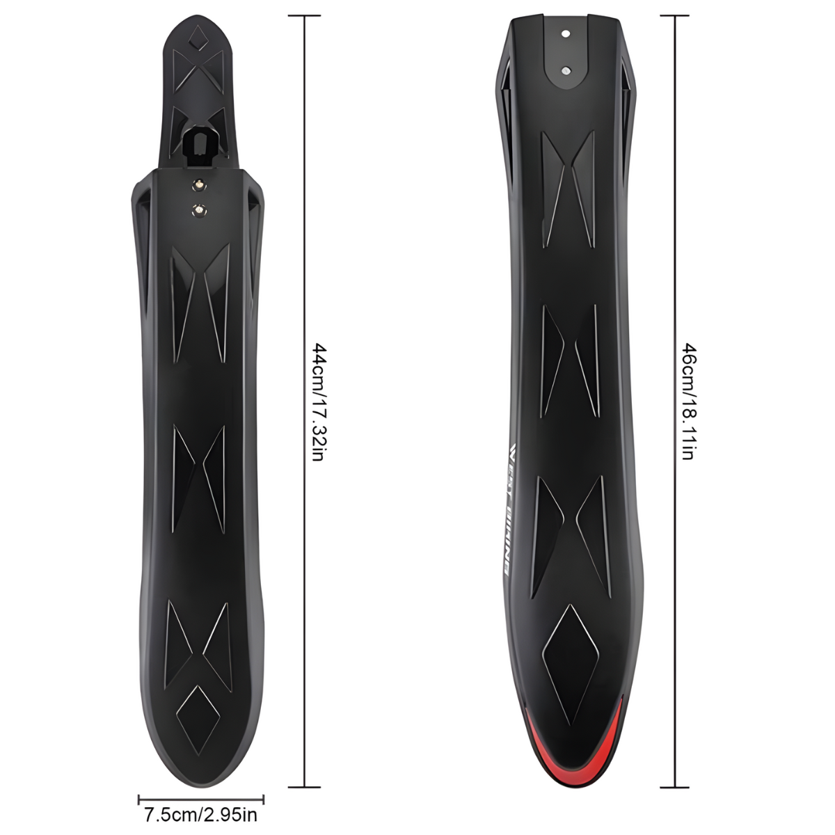 El par de guardabarros universales para bicicleta de montaña es un accesorio esencial. Ofrece protección contra salpicaduras de agua, barro y suciedad. Resulta ideal para el ciclismo en terrenos exigentes. El conjunto incluye dos piezas independientes. Cuenta con un guardabarros delantero y uno trasero. Ambos se adaptan fácilmente a la mayoría de bicicletas tipo MTB.